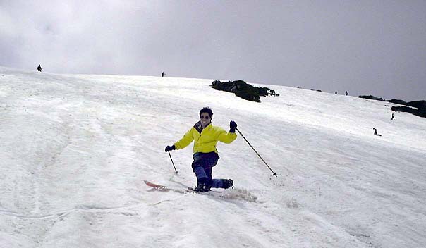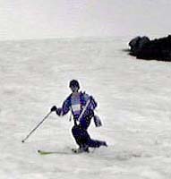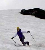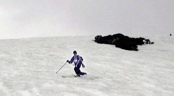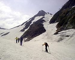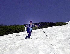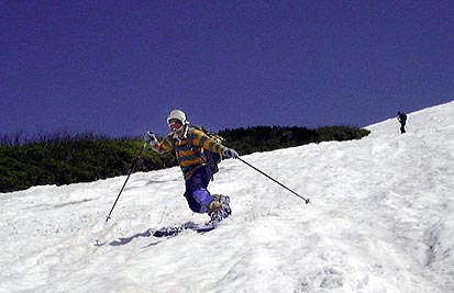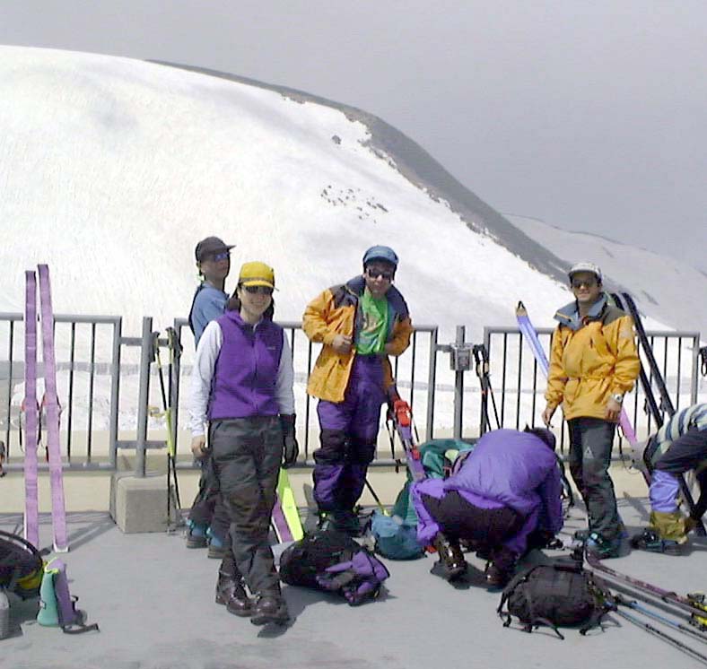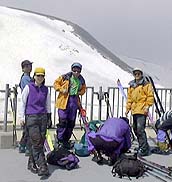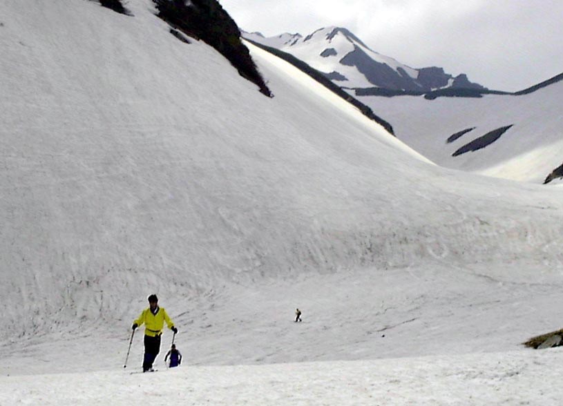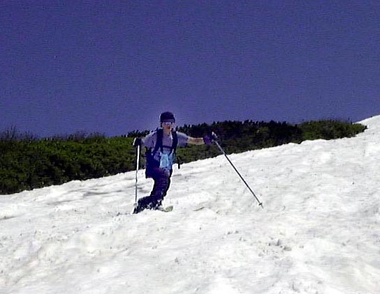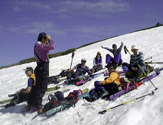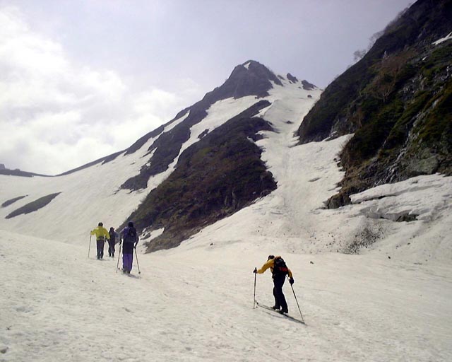 さすがにもう初夏の雪渓状態で、雨が流れて抉った跡に、スキーを取られて、なかなか滑走も思うようにいかなかった。それでも皆果敢にチャレンジした。