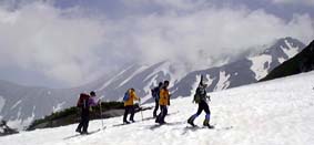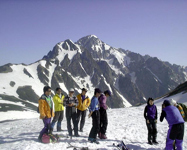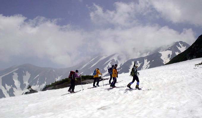 雷鳥平からスキーにシールを付けて登ったが、後半はさすがに殆どのメンバーがスキーを脱いで担いで登った。