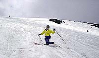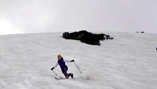 別山乗越で休憩した後はいつものように、剣御前に向かった。そして剣御前からはいつもの急斜面を剣沢小屋へ。しかし今年は雨 が多かったのだろうか、雨溝の深いこと。横切るとスキーがバイブレーションを起こすし、縦にはまると出られない位で堪らない。